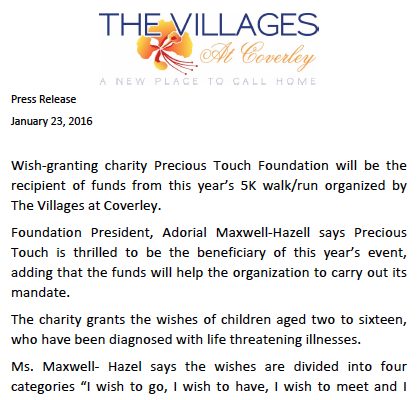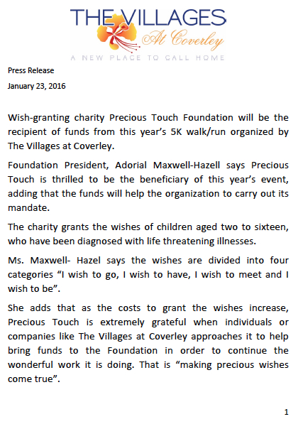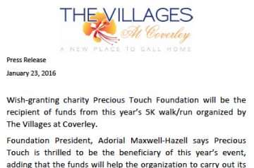 Wish-granting charity Precious Touch Foundation will be the recipient of funds from this year’s 5K walk/run organized by The Villages at Coverley. Precious Touch is extremely grateful when individuals or [...]